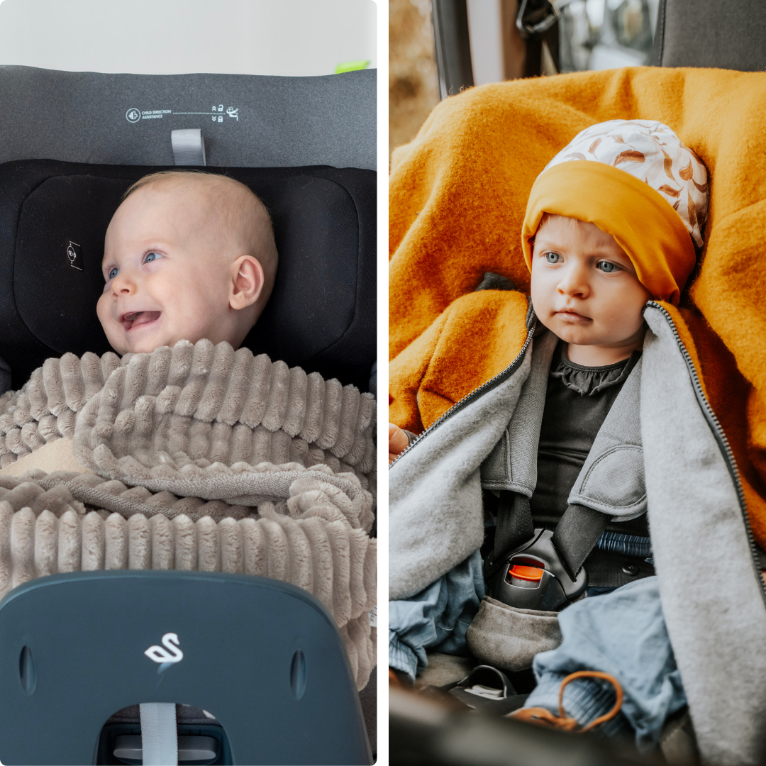Unsere Kindersitzponchos & Einschlagdecken sind so gemacht, dass der Gurt nah am Körper anliegt, während dein Kind schön eingekuschelt bleibt.