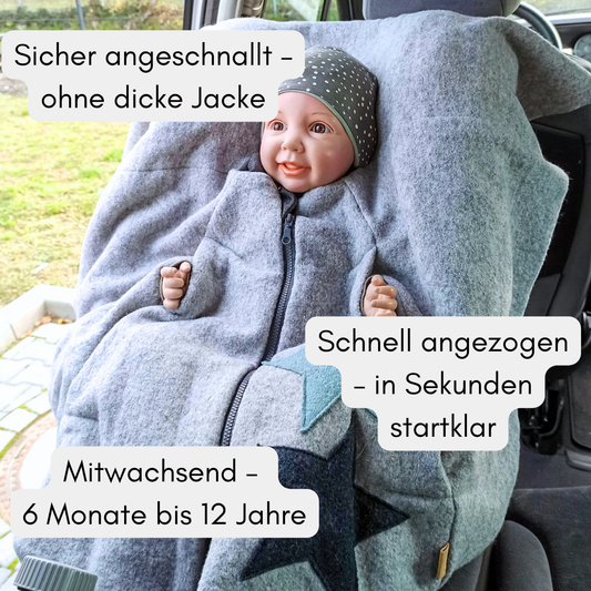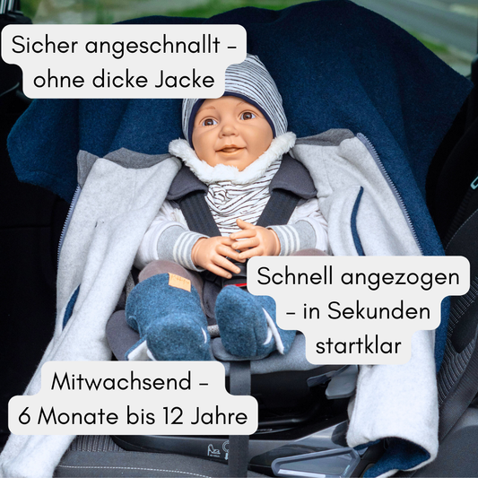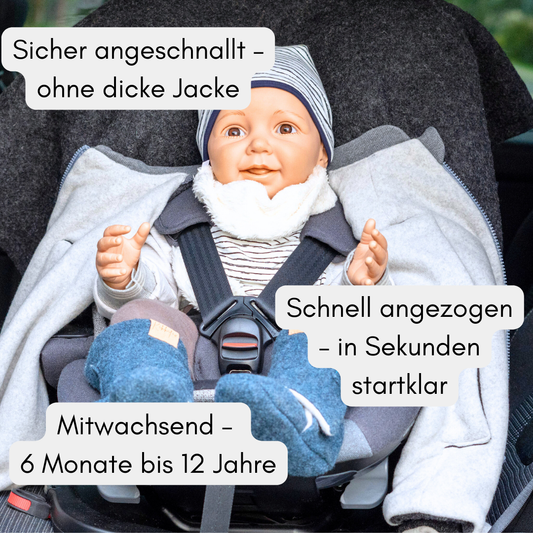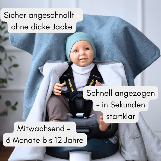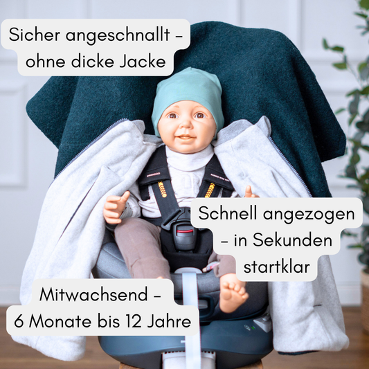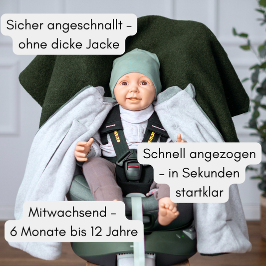 Erfahre, warum dicke Jacken im Kindersitz gefährlich sein können und wie unser Kindersitzponcho für mehr Sicherheit und Wärme sorgt – von der Babyschale bis zum Schulkinder-Sitz. In unseren FAQs findest du alle Antworten rund um die sichere Nutzung.