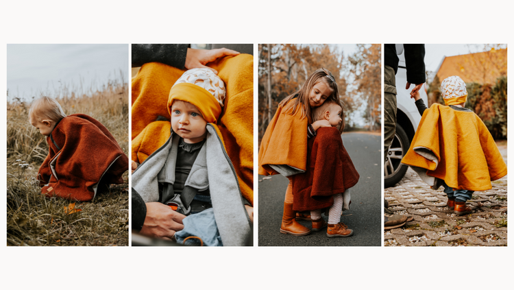 Onesize passt schon in die Babyschale und ist ideal für kleine Lauflinge. XL ist ab dem ersten aufrechten Kindersitz die beste Wahl – besonders für größere Kinder, die den Poncho auch außerhalb des Autos tragen. Er bietet extra Wärme, mehr Rundumschutz und eine abnehmbare Kapuze für draußen.