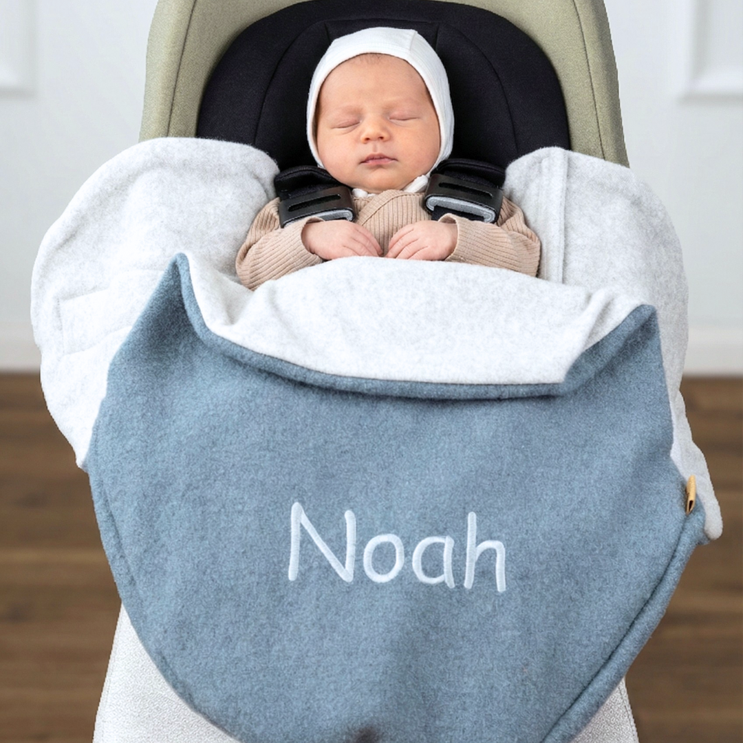 Wir besticken eure Decke auf Wunsch mit dem Namen deines Babys oder einem kurzen Wort, das euch wichtig ist. So wird aus einer praktischen Einschlagdecke ein besonderes Erinnerungsstück – auch ideal als Geschenk zur Geburt oder Taufe.