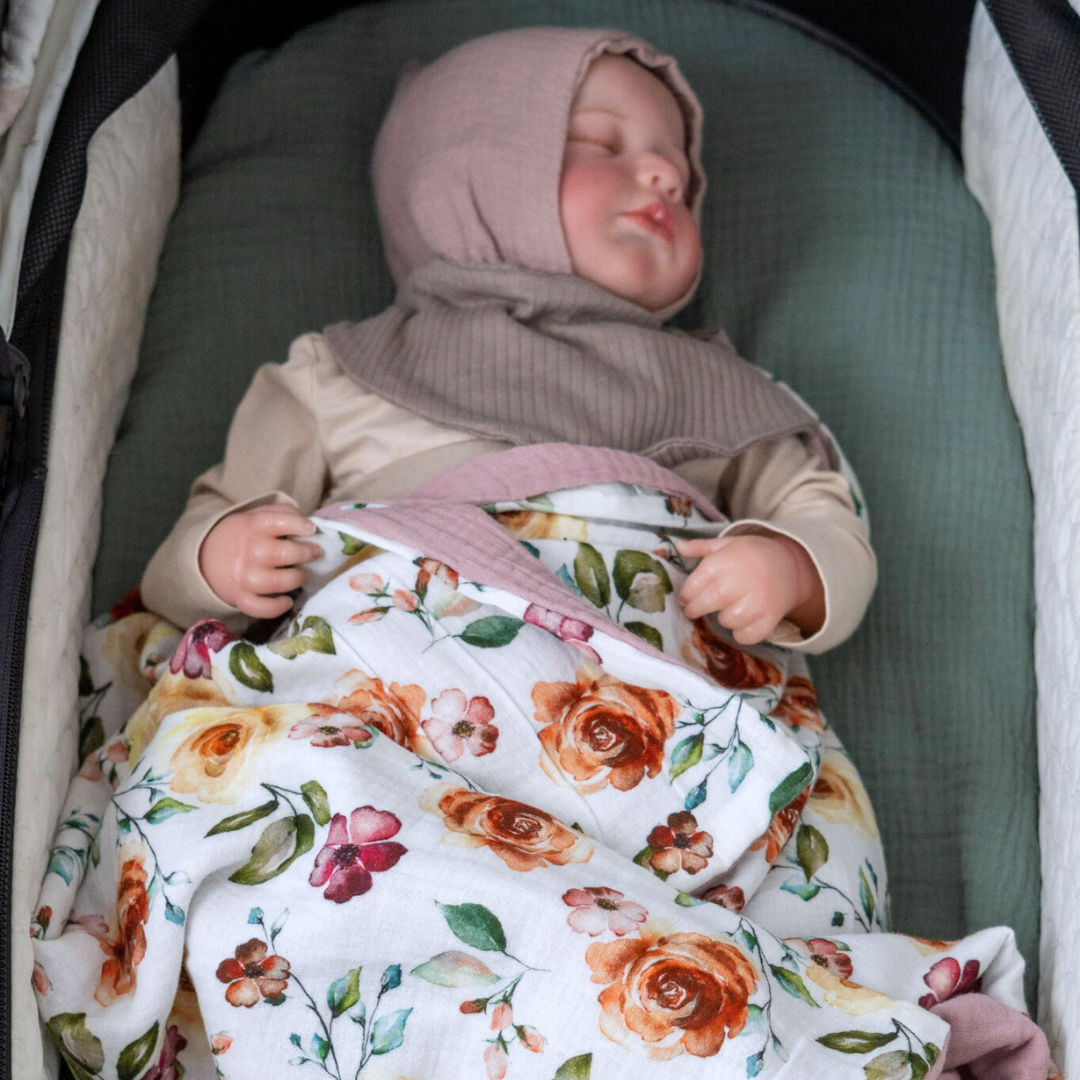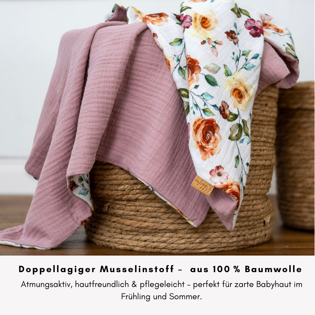 Unsere zweilagige Musselin Babydecke ist die perfekte Begleiterin für warme Tage – egal ob unterwegs im Kinderwagen oder zuhause beim Kuscheln. Die Decke besteht aus zwei Lagen weichem Baumwoll-Musselin: eine Seite ist einfarbig, die andere liebevoll gemustert.