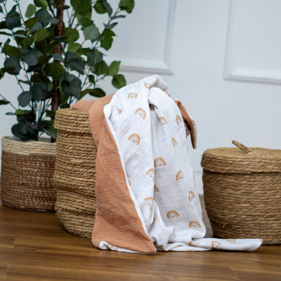 Zweilagige Musselin Babydecke – eine Seite einfarbig, eine Seite gemustert