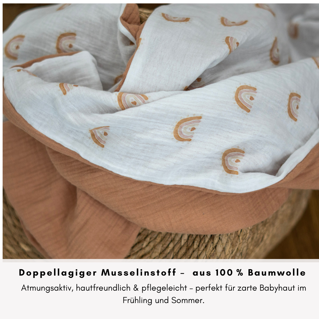 Unsere zweilagige Musselin Babydecke ist die perfekte Begleiterin für warme Tage – egal ob unterwegs im Kinderwagen oder zuhause beim Kuscheln. Die Decke besteht aus zwei Lagen weichem Baumwoll-Musselin: eine Seite ist einfarbig, die andere liebevoll gemustert.