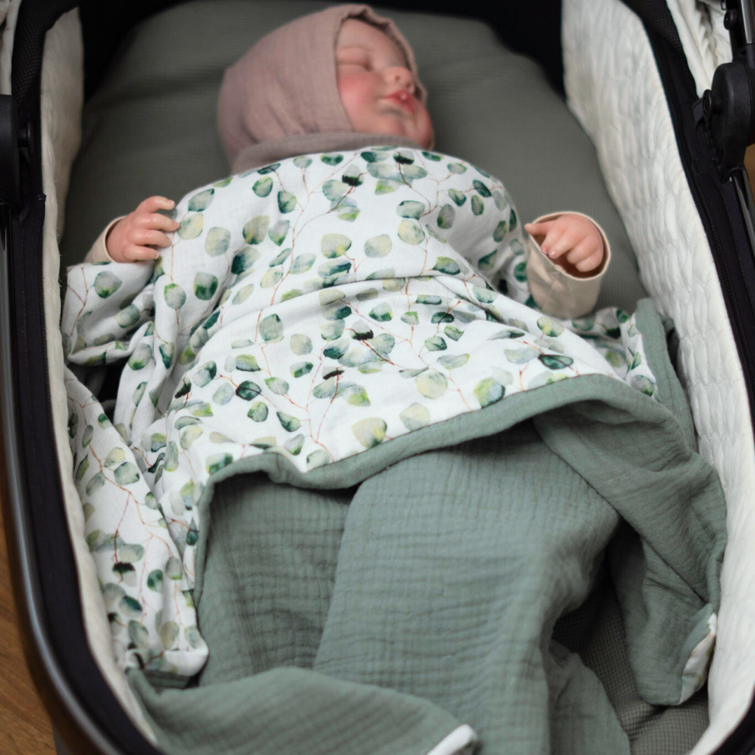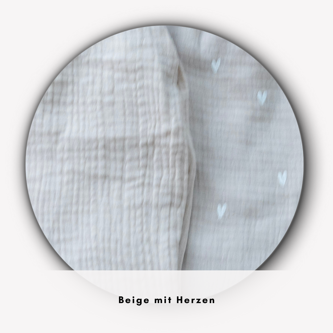 Unser Musselin-Set sorgt unterwegs für Komfort und Schutz – ob im Kinderwagen oder in der Babyschale. Achte bitte immer darauf, dass das Gesicht und die Atemwege deines Babys frei bleiben und ausreichend Luft zirkulieren kann.