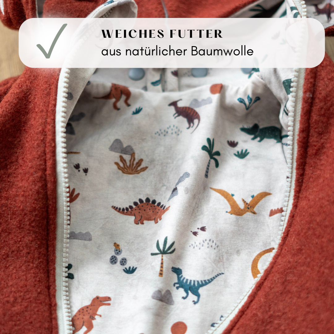 Dein Kind verdient nur das Beste! Der Außenstoff besteht aus 100 % Schurwolle – einem natürlichen, hautfreundlichen Material, das nicht nur wärmt, sondern auch atmungsaktiv ist. Innen sorgt weicher Baumwolljersey für ein angenehmes Gefühl auf der Haut. So ist dein Kind rundum gut geschützt und fühlt sich den ganzen Tag wohl.