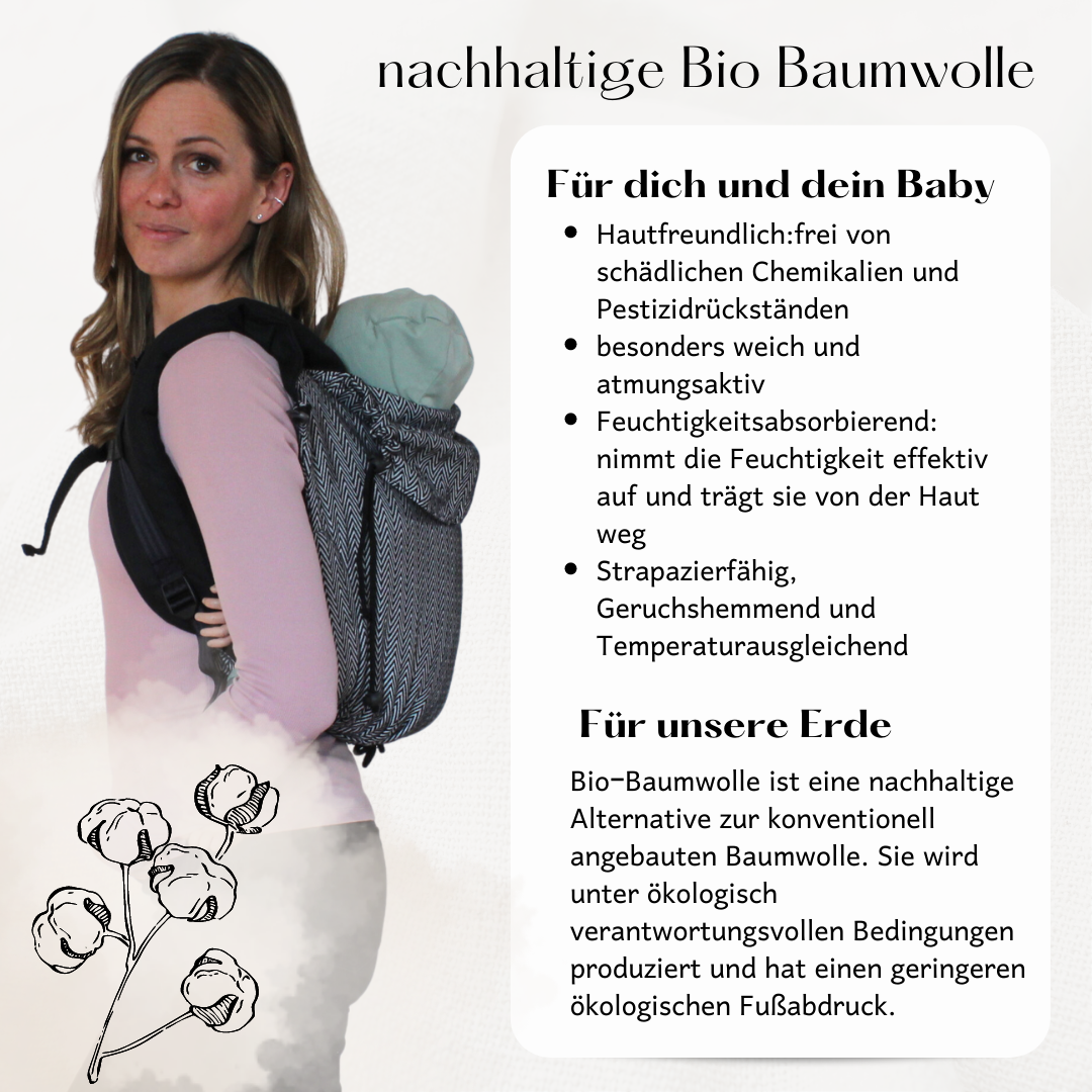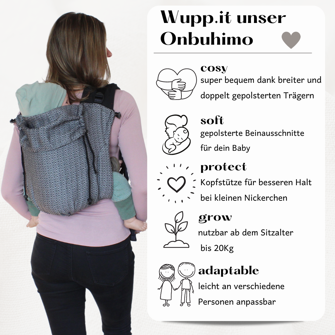Durch den fehlenden Hüftgurt ist der Onbuhimo Wupp.it die perfekte Rückentrage und in sekundenschnelle auf- und abgesetzt - und auch in den Folgeschwangerschaften bequem nutzbar.