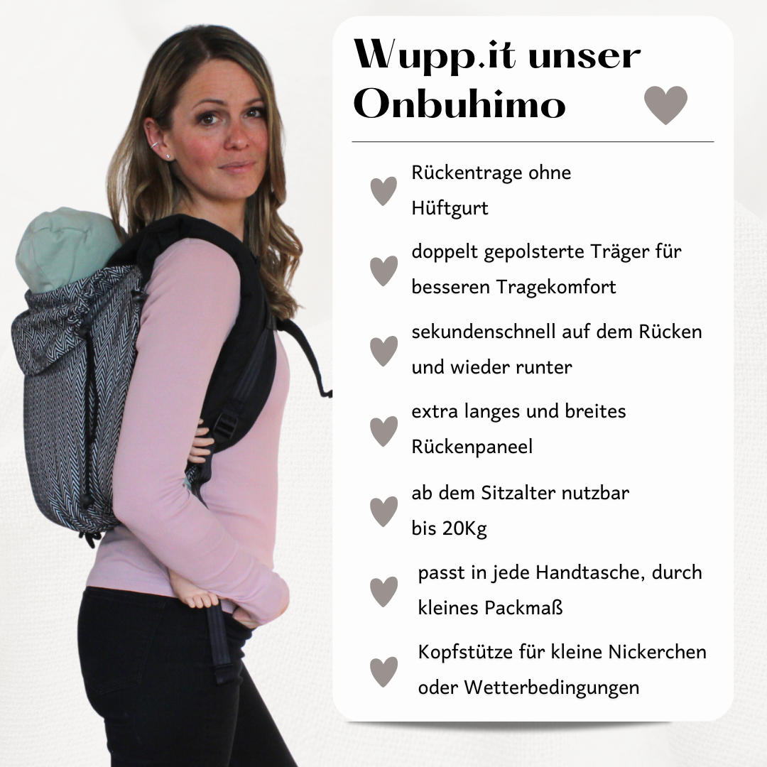 Durch den fehlenden Hüftgurt ist der Onbuhimo Wupp.it die perfekte Rückentrage und in sekundenschnelle auf- und abgesetzt - und auch in den Folgeschwangerschaften bequem nutzbar.